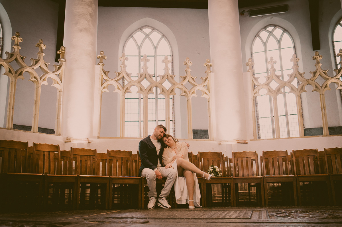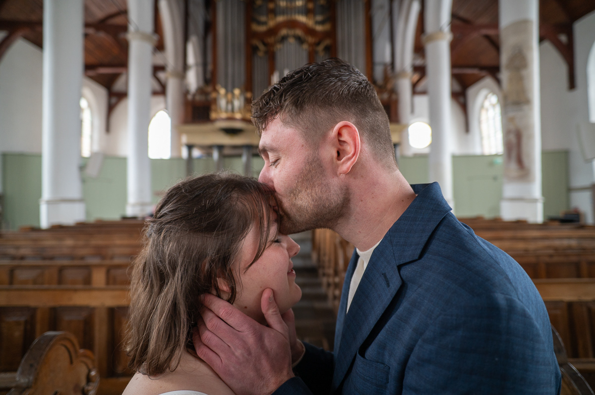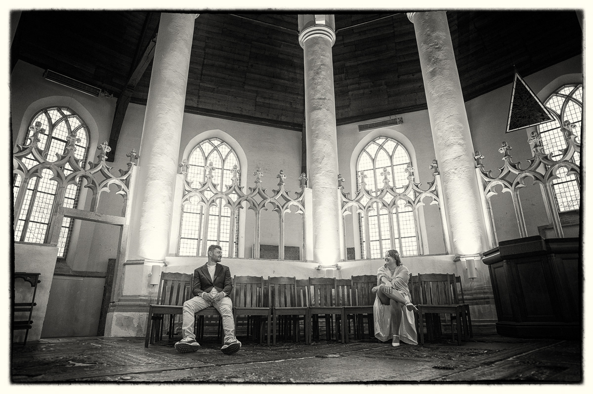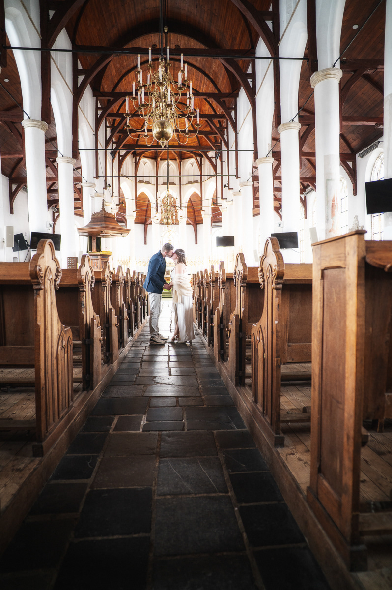 Onze sessie begon bij de iconische Martini Kerk in Franeker. Hoewel de kerk een religieuze oorsprong heeft, hoef je absoluut niet gelovig te zijn om hier de vruchten te plukken van de architectuur. Het zachte licht en de imposante muren vormen het perfecte, tijdloze decor voor intieme portretten. Het geeft direct een statige en professionele look aan je fotoreportage.
