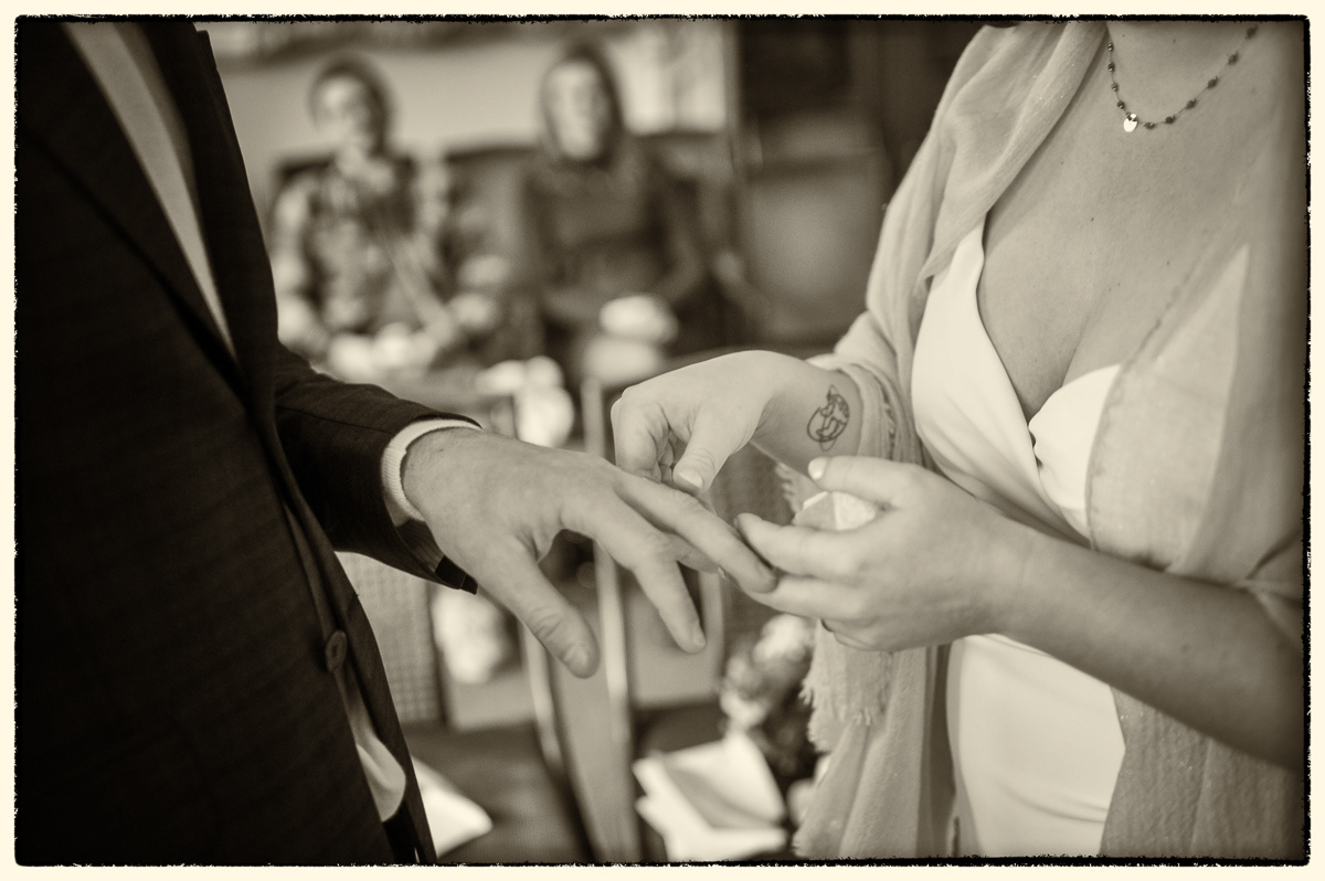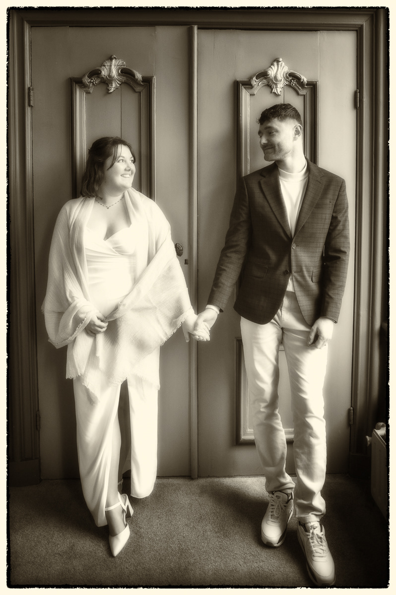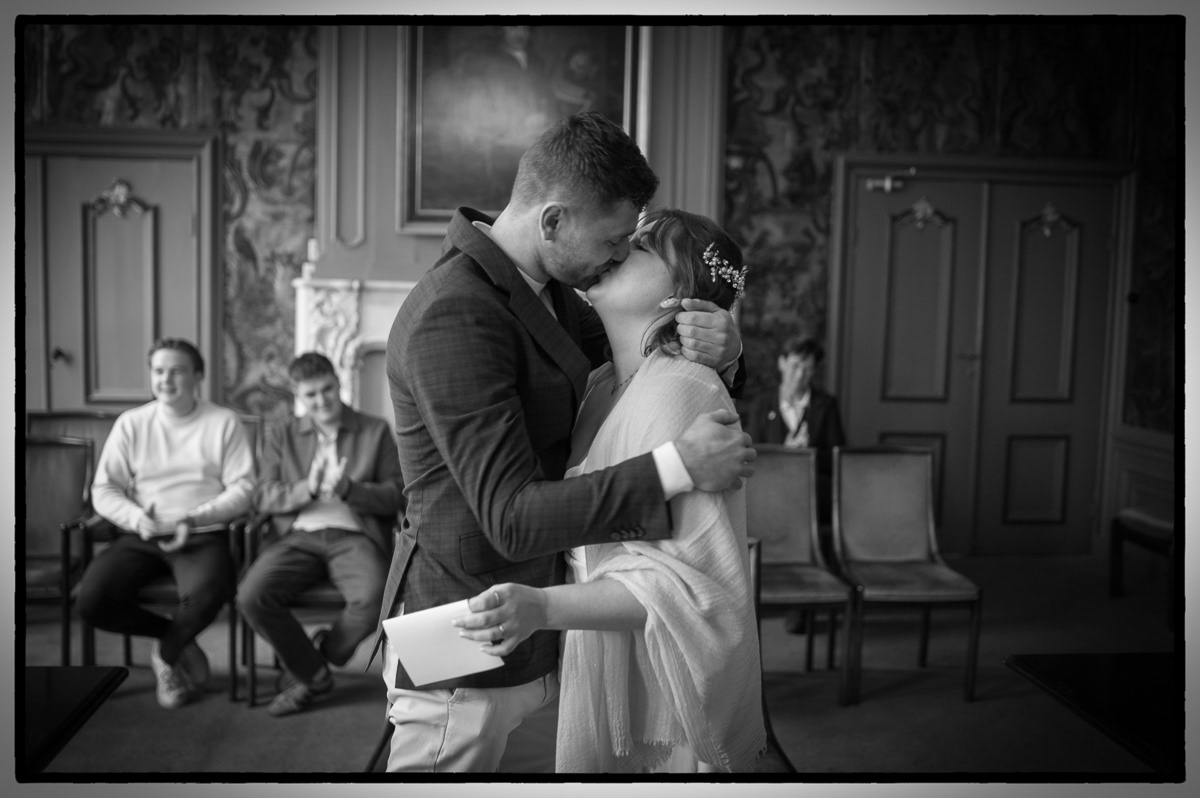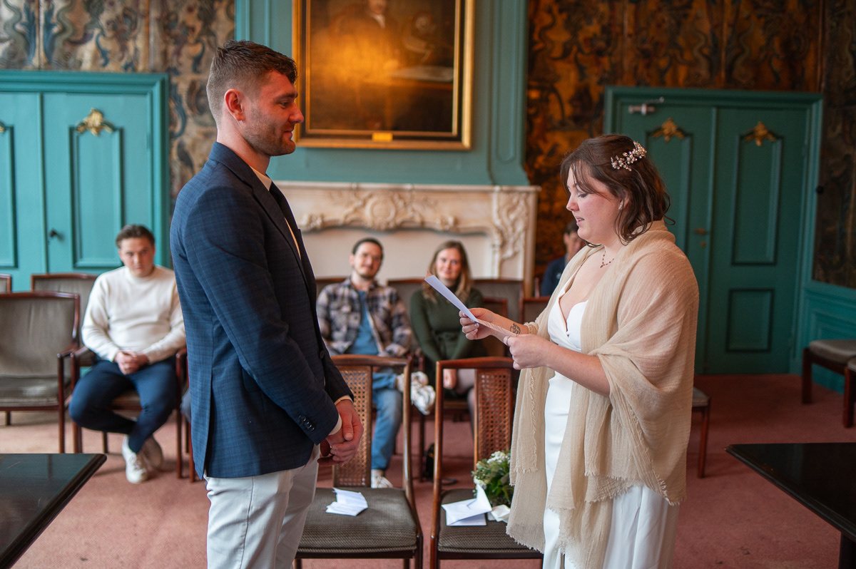 Na de fotoshoot bij de kerk wandelden we naar het Stadhuis van Franeker, zonder twijfel een van de mooiste locaties in Friesland om een partnerschap officieel te maken. De historische sfeer in de trouwzaal zorgt voor een ceremonie met allure, of je nu groots uitpakt of het klein en intiem houdt.