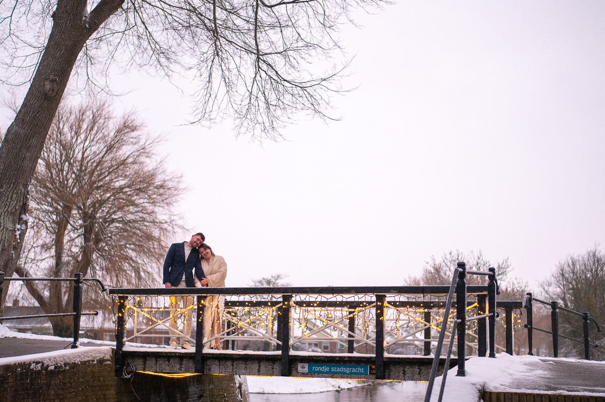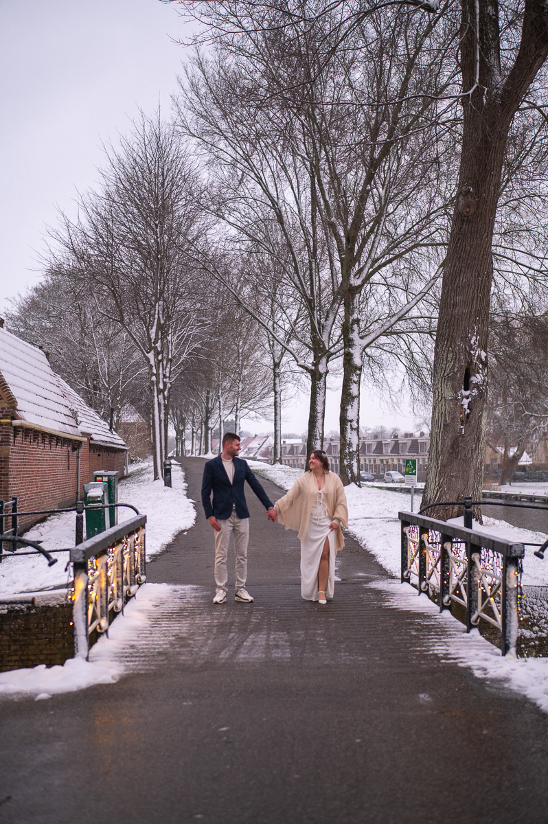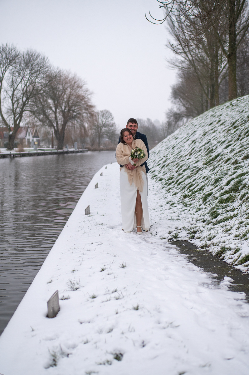 Als kers op de taart brachten we een bezoek aan het Bolwerk. Waar fotografen vaak jaren op wachten, gebeurde eindelijk: sneeuw! Een bruidspaar fotograferen in een wit winterlandschap geeft een magisch effect dat je niet kunt plannen, maar waar we optimaal gebruik van hebben gemaakt.
