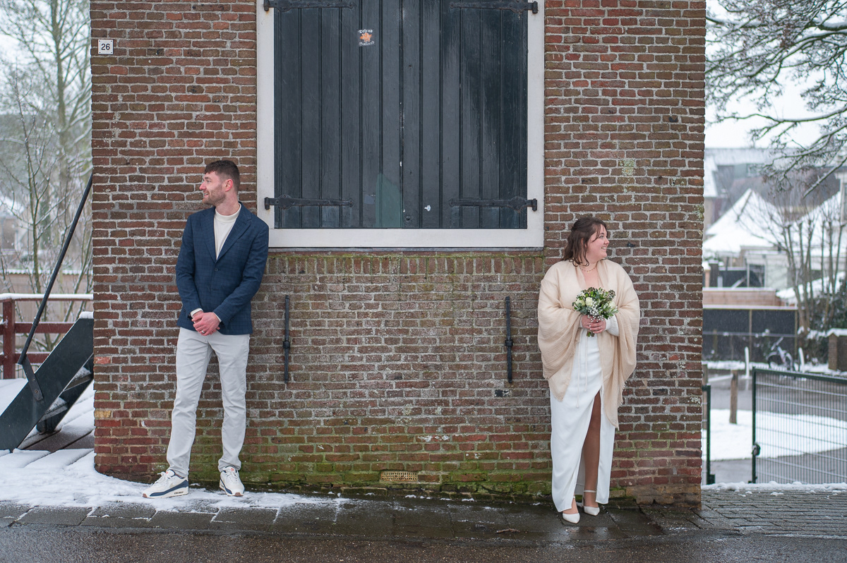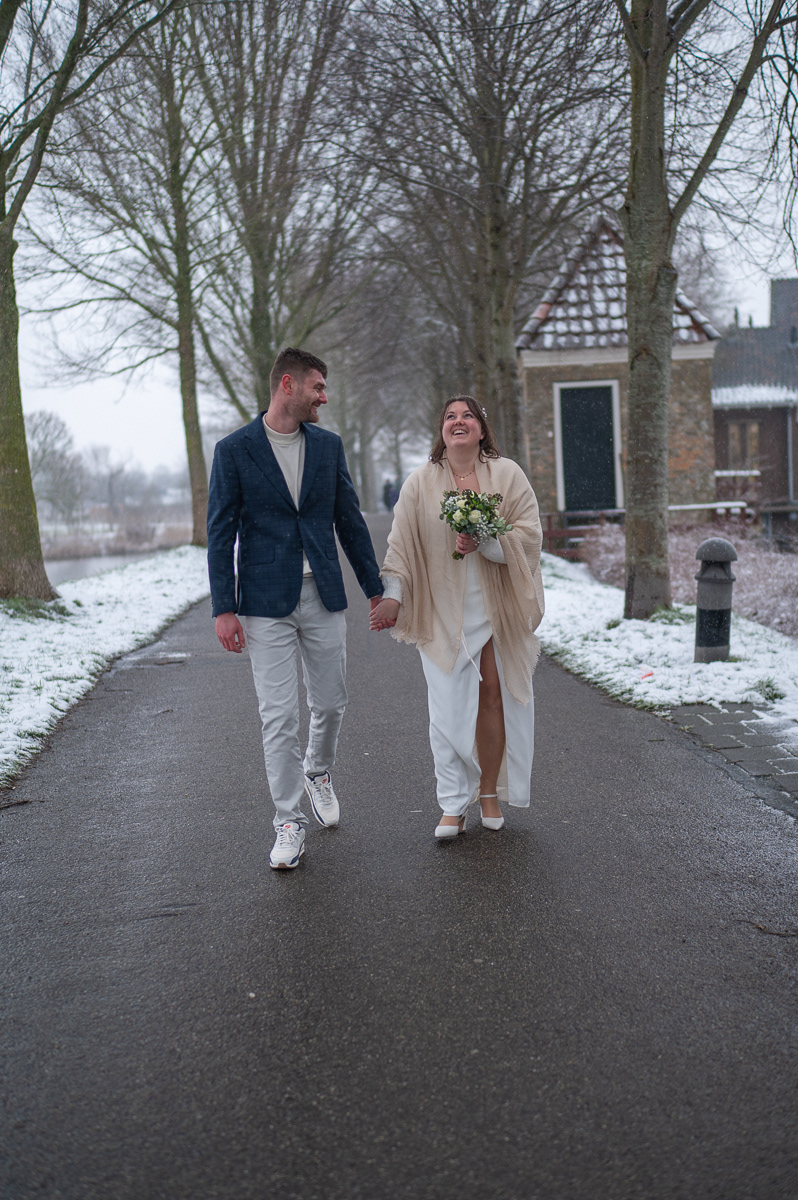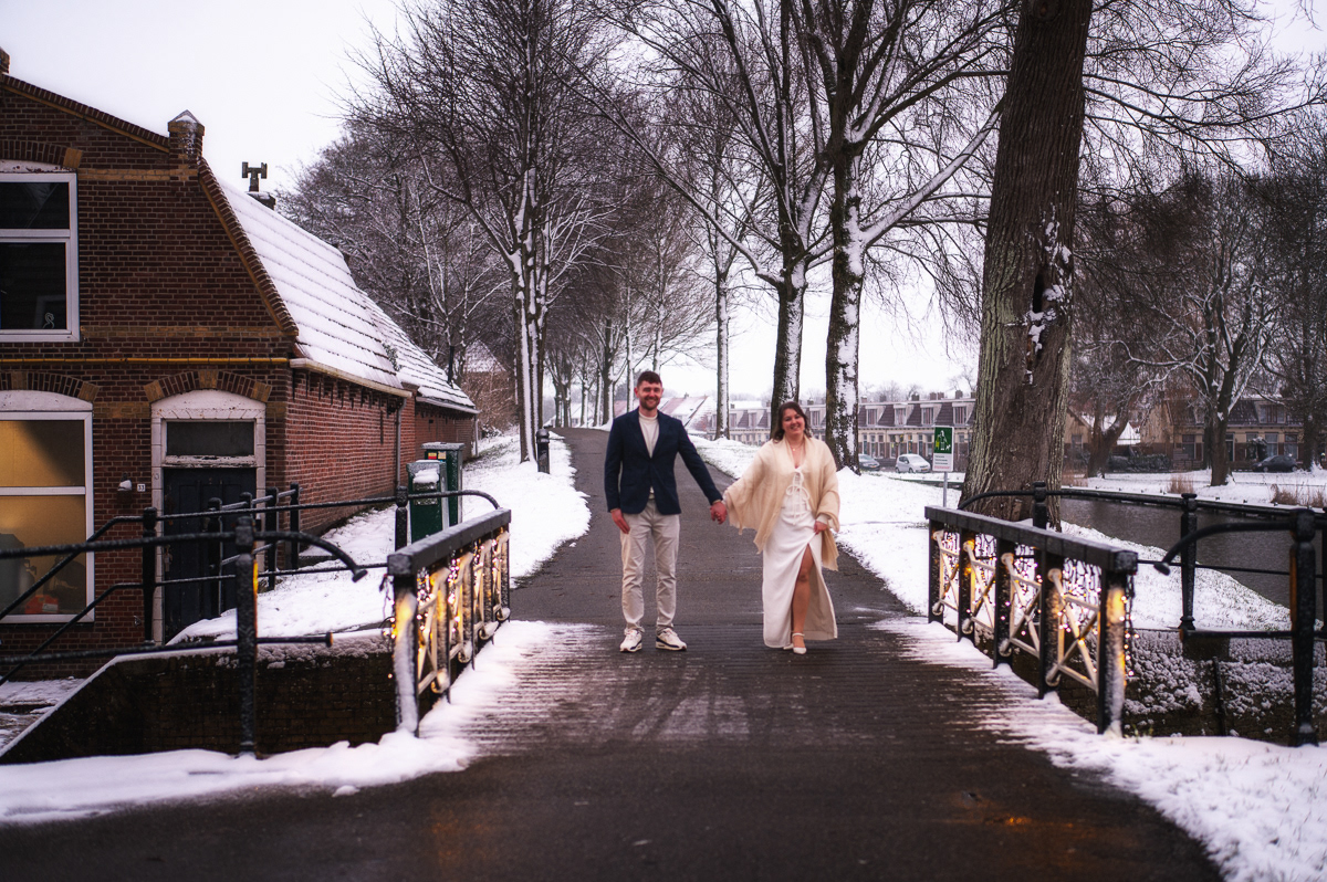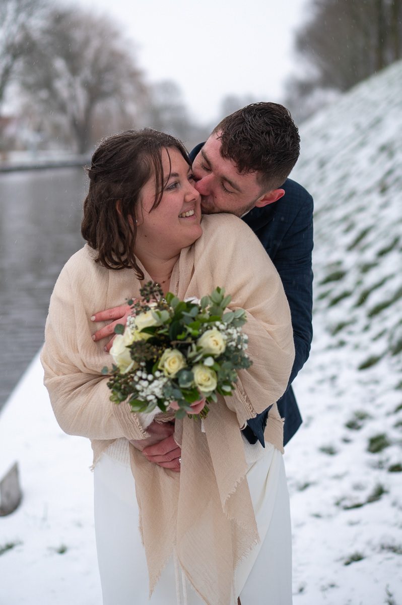 Als kers op de taart brachten we een bezoek aan het Bolwerk. Waar fotografen vaak jaren op wachten, gebeurde eindelijk: sneeuw! Een bruidspaar fotograferen in een wit winterlandschap geeft een magisch effect dat je niet kunt plannen, maar waar we optimaal gebruik van hebben gemaakt.